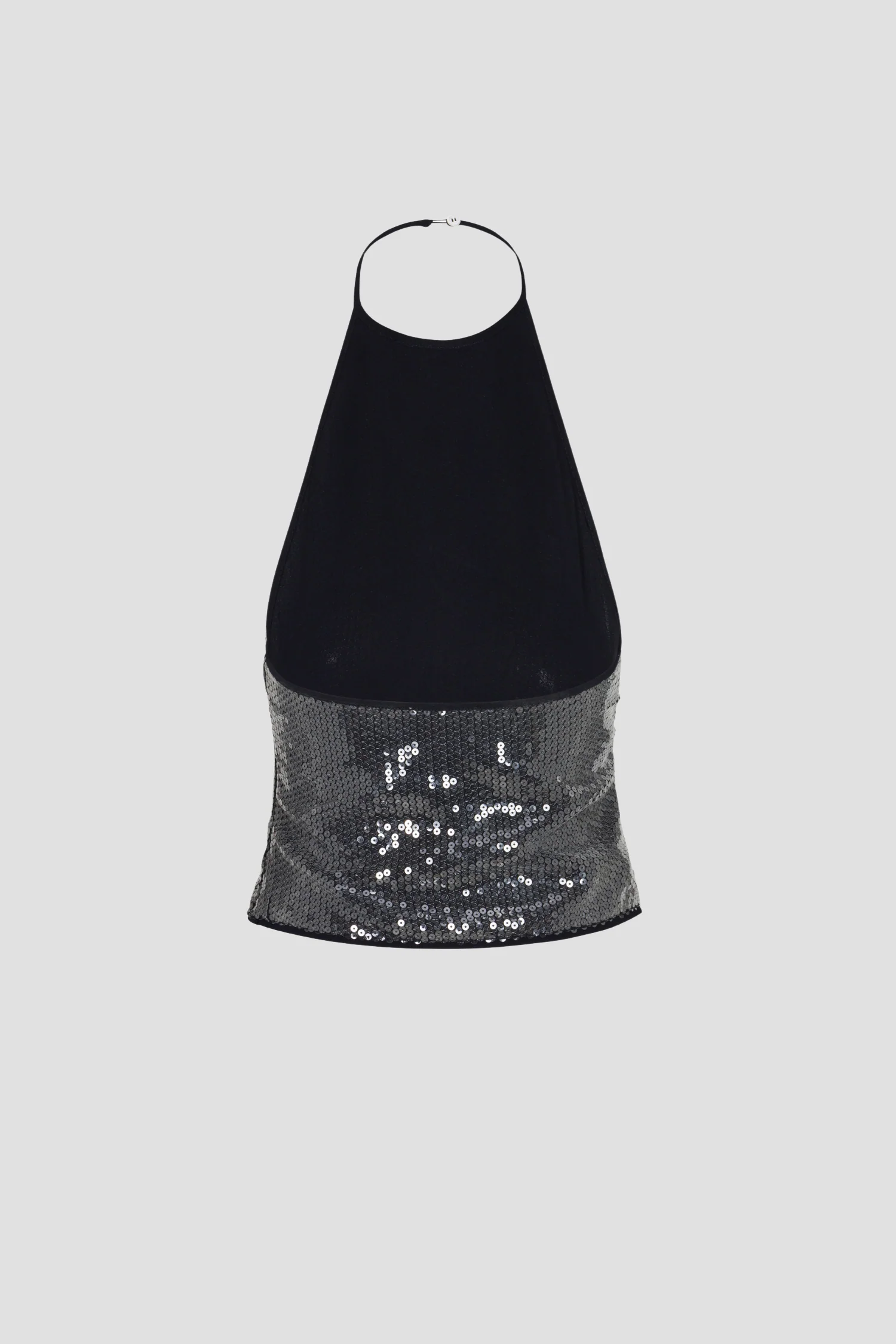 Meet the Natalia in Black Sequin. Crafted from sequin mesh material, this tank features a button-closure halter, size zipper, and low back. Pair with the matching skirt and look perfect at your next holiday party.