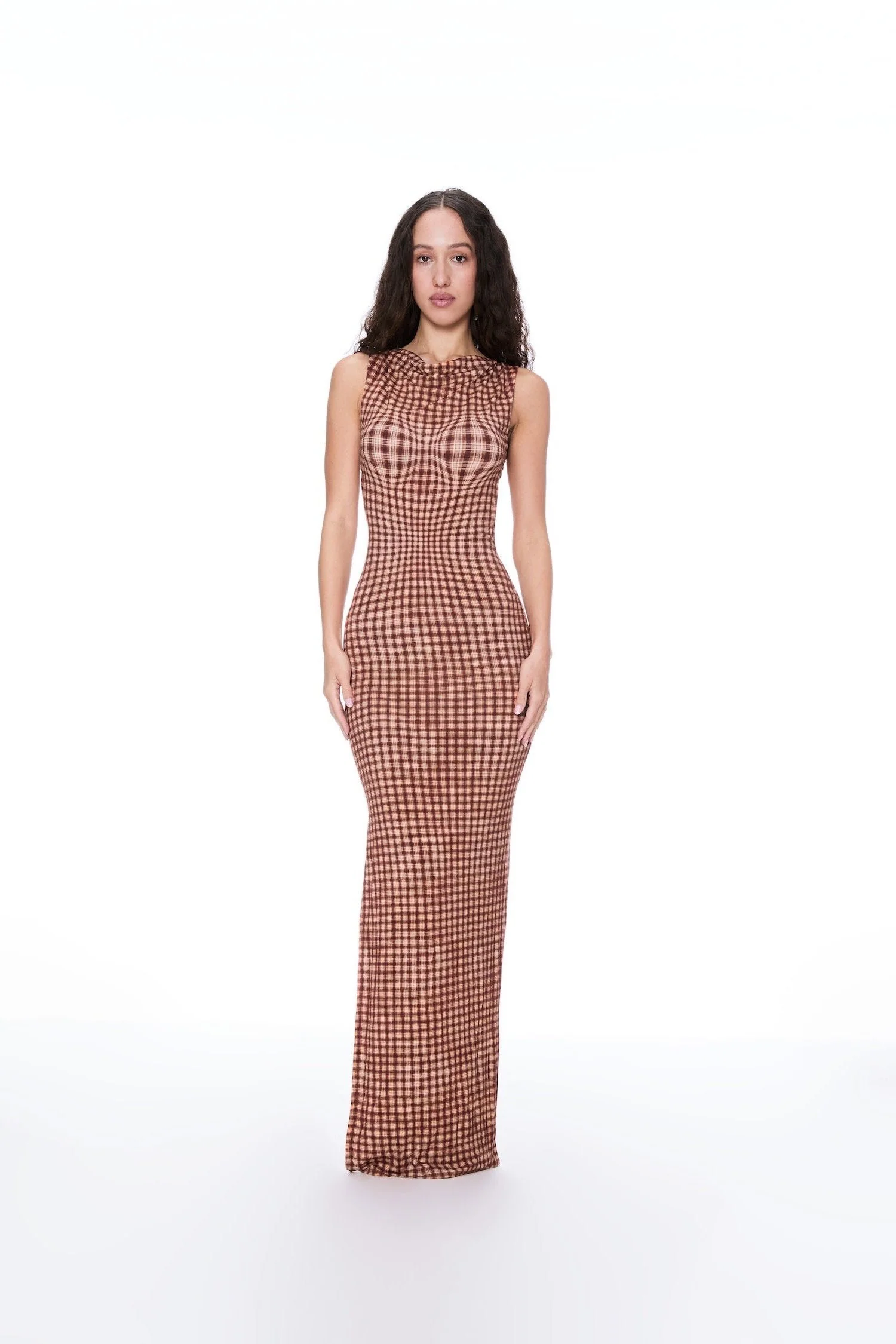 Elevate your evening with our Selena Dress in Warped Plaid. This fitted, maxi-length beauty is designed to flatter with its cinched waist and open back detailing. She's the long dress you've been waiting for.